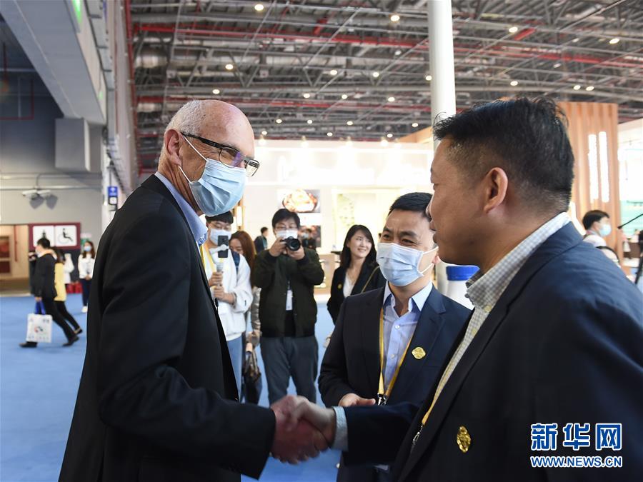 11月5日,罗伊(左)在第三届进博会现场同合作伙伴交谈。新华社记者 赵丁喆 摄