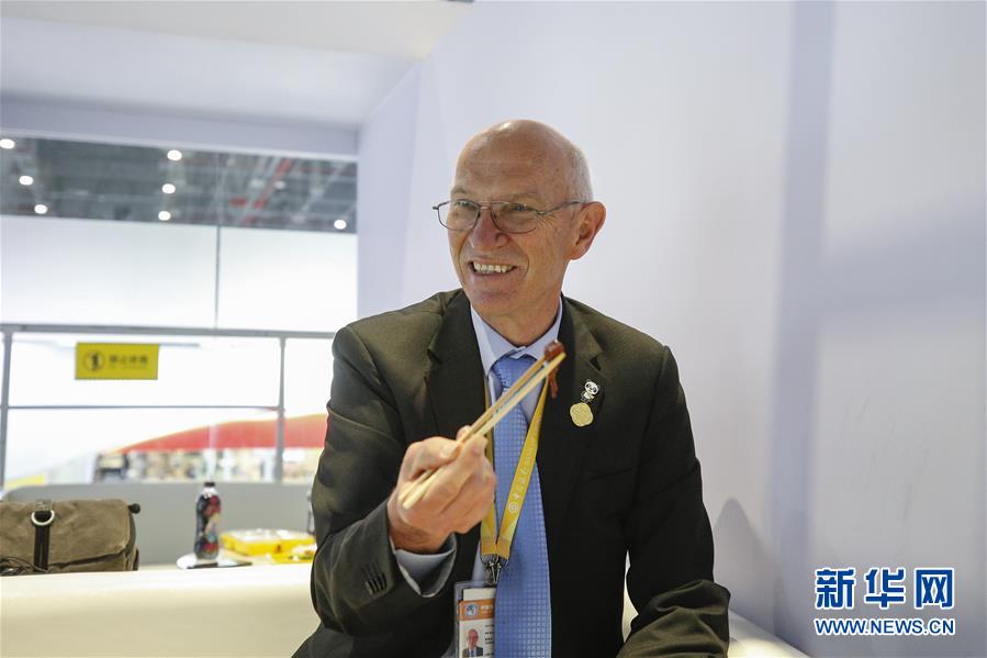 11月7日,午休时,罗伊在第三届进博会纽仕兰乳业展台使用筷子吃饭。新华社记者 张玉薇 摄