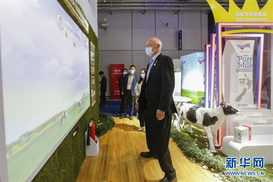 11月7日,罗伊在第三届进博会纽仕兰乳业展台试玩互动游戏。新华社记者 张玉薇 摄
