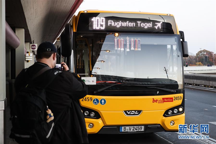 11月8日,一名男子在德国柏林拍摄一辆终点站为泰格尔机场的公交车。 随着德国柏林-勃兰登堡机场的启用,柏林泰格尔机场于8日正式关闭。 新华社记者单宇琦摄