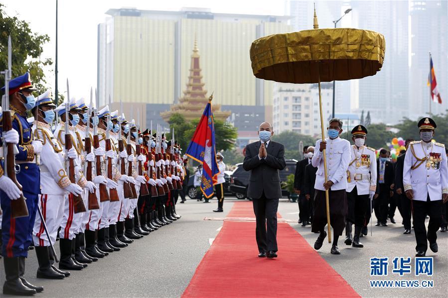 11月9日,在柬埔寨金边,柬埔寨国王西哈莫尼(中)检阅仪仗队。 在柬埔寨已故太皇西哈努克的领导下,柬埔寨人民于1953年11月9日摆脱了法国近一百年的殖民统治,赢得了国家的独立。 新华社发(索万纳拉摄)