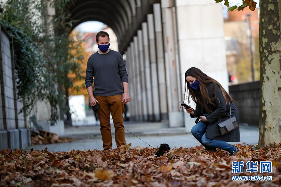 11月8日,戴着口罩的市民在比利时布鲁塞尔与小狗嬉戏。 比利时国家公共卫生研究所9日发布的新冠疫情数据显示,该国累计确诊病例达500789例。 新华社记者 张铖 摄