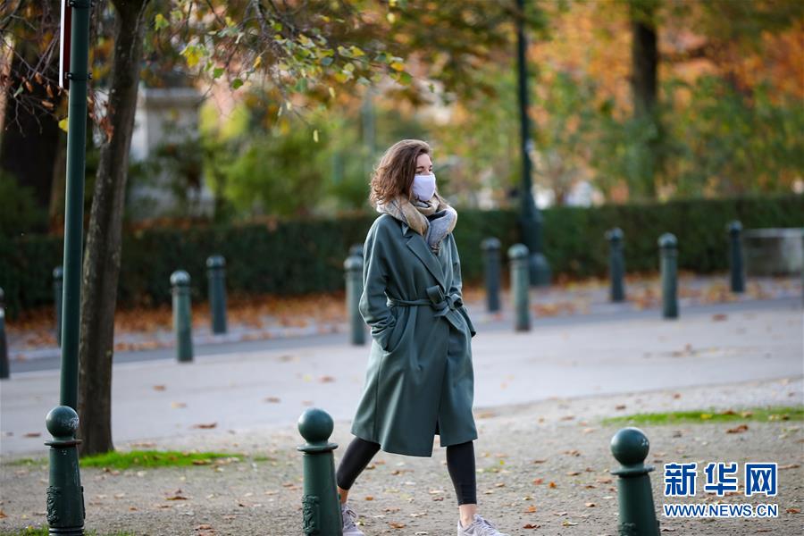 11月8日,一名戴着口罩的女子走在比利时布鲁塞尔街头。 比利时国家公共卫生研究所9日发布的新冠疫情数据显示,该国累计确诊病例达500789例。 新华社记者 张铖 摄