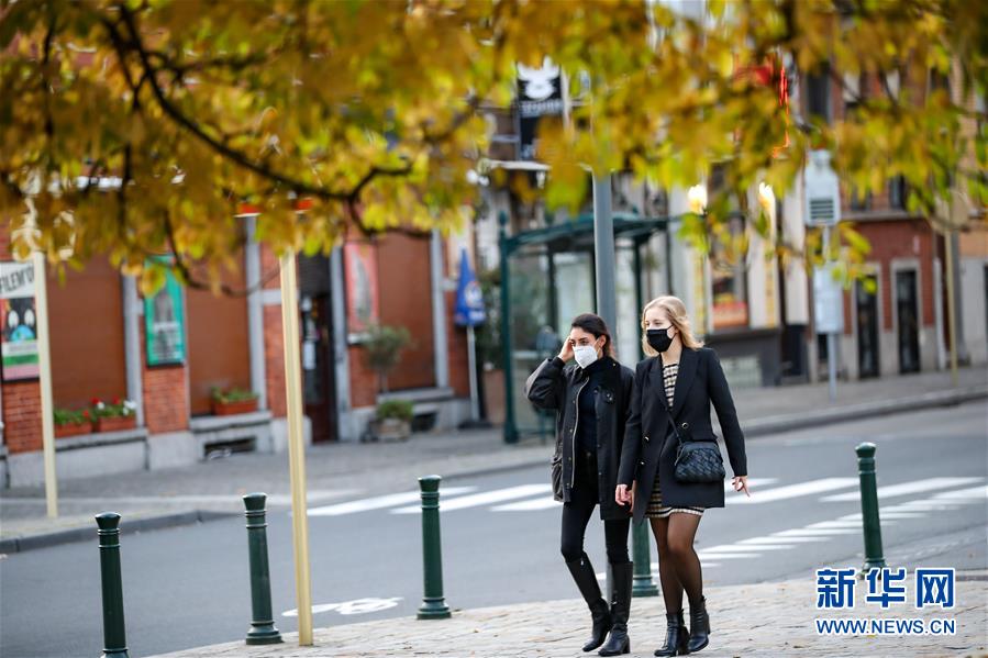 11月8日,戴着口罩的行人走在比利时布鲁塞尔街头。 比利时国家公共卫生研究所9日发布的新冠疫情数据显示,该国累计确诊病例达500789例。 新华社记者 张铖 摄