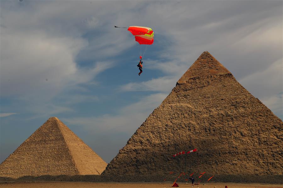 11月8日,在埃及吉萨,一名跳伞运动员进行跳伞表演。 第三届埃及国际跳伞节8日在埃及吉萨金字塔区域举行。 新华社发(艾哈迈德·戈马摄)