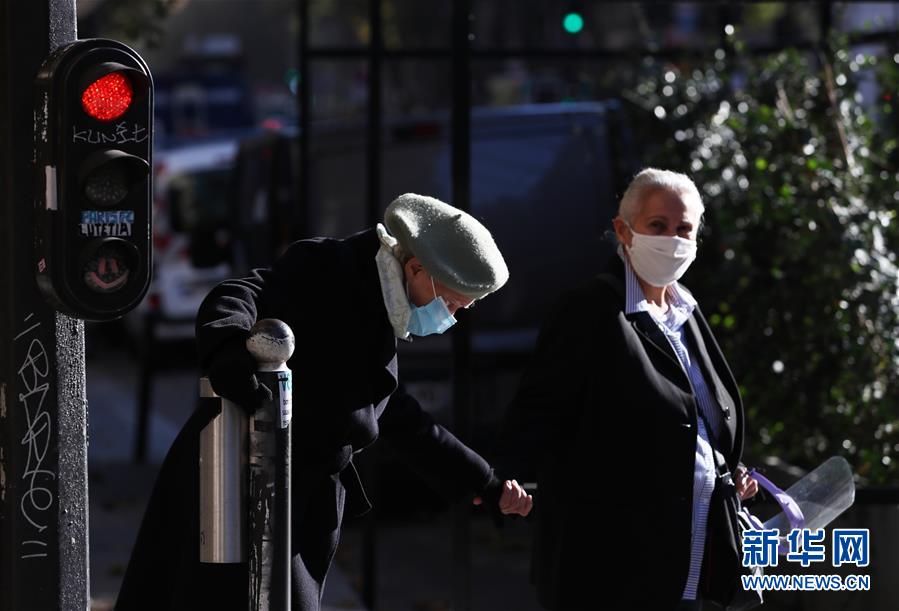 11月9日,两名老人在法国巴黎街头过马路。 法国国民议会7日投票通过了延长“卫生紧急状态”的法案,“卫生紧急状态”将延长至2021年2月16日。 新华社记者 高静 摄