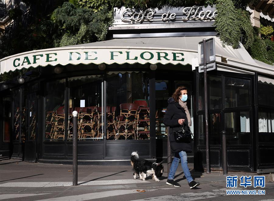 11月9日,在法国巴黎,一名女子经过停业的花神咖啡馆。 法国国民议会7日投票通过了延长“卫生紧急状态”的法案,“卫生紧急状态”将延长至2021年2月16日。 新华社记者 高静 摄