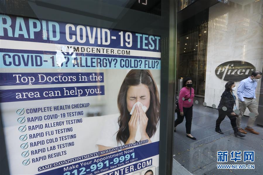 11月9日,在美国纽约,人们从一处快速检测新冠病毒的广告旁走过。 美国约翰斯·霍普金斯大学9日发布的新冠疫情最新统计数据显示,美国累计确诊病例超过1000万例。截至美国东部时间9日13时25分(北京时间10日2时25分),美国累计确诊病例10018278例,累计死亡病例237742例。美国是全球累计确诊病例数和累计死亡病例数最多的国家。 新华社记者 王迎 摄
