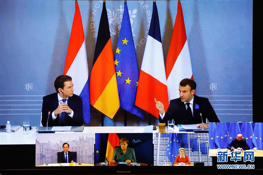 这是11月10日在比利时布鲁塞尔拍摄的奥地利总理库尔茨(上左)和法国总统马克龙(上右)出席视频会议的屏幕画面。 当日,欧盟与奥地利、德国、法国和荷兰领导人举行视频会议,共商欧洲反恐问题。 新华社发(欧盟供图)