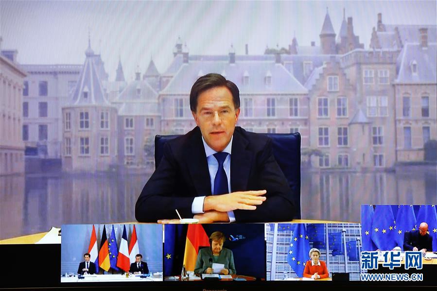 这是11月10日在比利时布鲁塞尔拍摄的荷兰首相吕特(上)出席视频会议的屏幕画面。 当日,欧盟与奥地利、德国、法国和荷兰领导人举行视频会议,共商欧洲反恐问题。 新华社发(欧盟供图)
