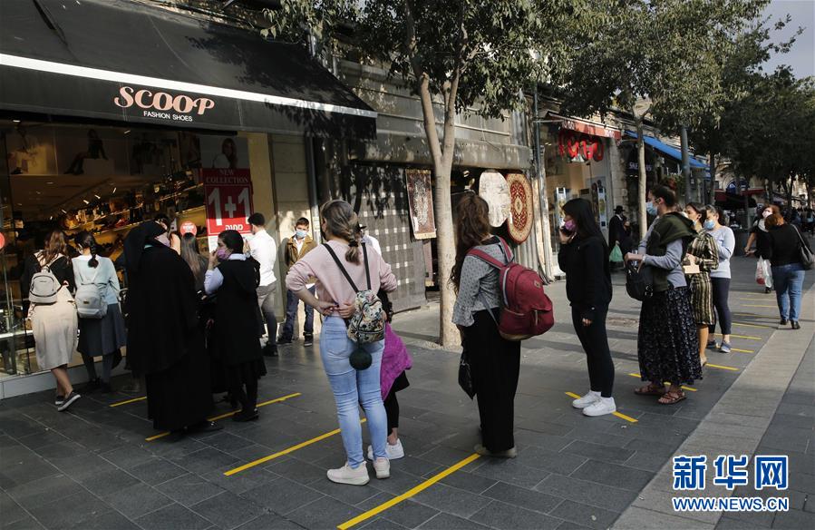 11月10日,在耶路撒冷,人们排队等待进入一家街头商店。 耶路撒冷于8日起放松防疫限制措施,允许街头商店重新开业,但商店内人员数量有一定限制。 新华社发(吉尔·科恩·马根摄)