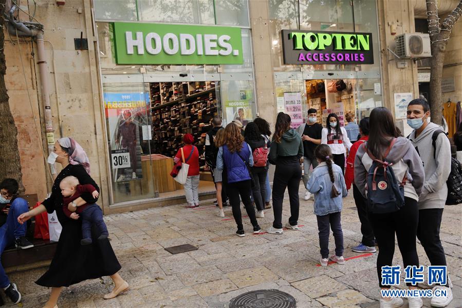 11月10日,在耶路撒冷,人们排队等待进入一家街头商店。 耶路撒冷于8日起放松防疫限制措施,允许街头商店重新开业,但商店内人员数量有一定限制。 新华社发(吉尔·科恩·马根摄)