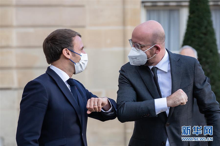 11月12日,法国总统马克龙(左)在巴黎总统府爱丽舍宫迎接前来参加巴黎和平论坛的欧洲理事会主席米歇尔。 第三届巴黎和平论坛11日至13日在法国巴黎举行。 新华社发(奥雷利安·莫里萨尔 摄)