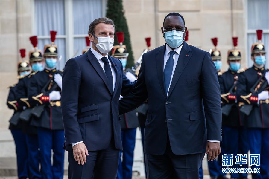 11月12日,法国总统马克龙(左)在巴黎总统府爱丽舍宫迎接前来参加巴黎和平论坛的塞内加尔总统萨勒。 第三届巴黎和平论坛11日至13日在法国巴黎举行。 新华社发(奥雷利安·莫里萨尔 摄)
