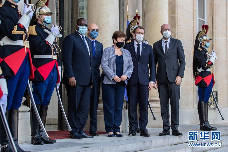 11月12日,在法国巴黎总统府爱丽舍宫,法国总统马克龙(右三)、巴黎和平论坛主席帕斯卡尔·拉米(右五)与前来参加巴黎和平论坛的塞内加尔总统萨勒(右六)、国际货币基金组织(IMF)总裁格奥尔基耶娃(右四)、欧洲理事会主席米歇尔(右二)合影。 第三届巴黎和平论坛11日至13日在法国巴黎举行。 新华社发(奥雷利安·莫里萨尔 摄)