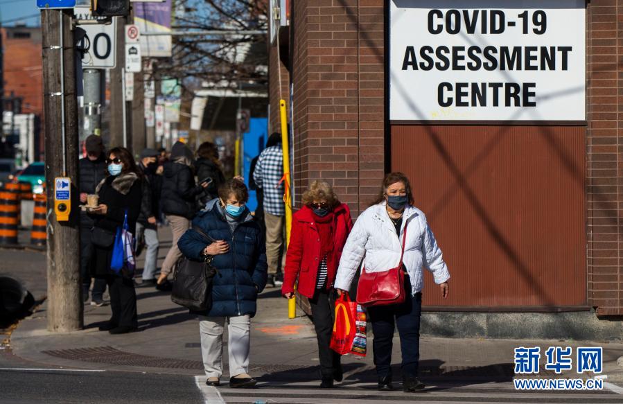 11月12日,在加拿大多伦多,戴口罩的行人经过一处新冠病毒检测中心。