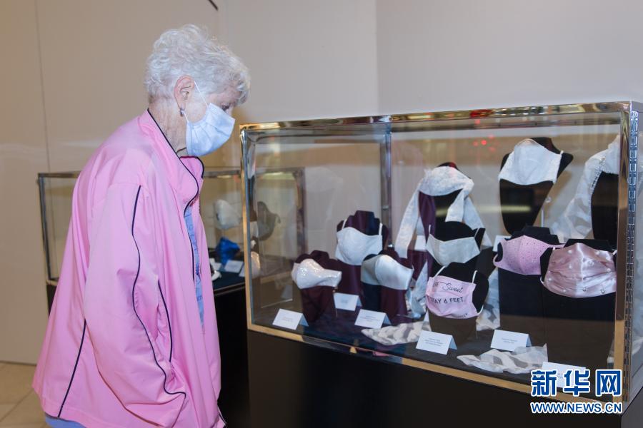 11月12日,在美国达拉斯,一位老人参观口罩时尚展览。
