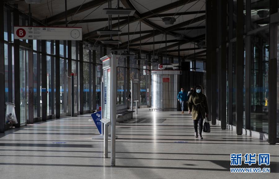 11月12日,戴口罩的人们在英国伦敦一处公交车站内行走。