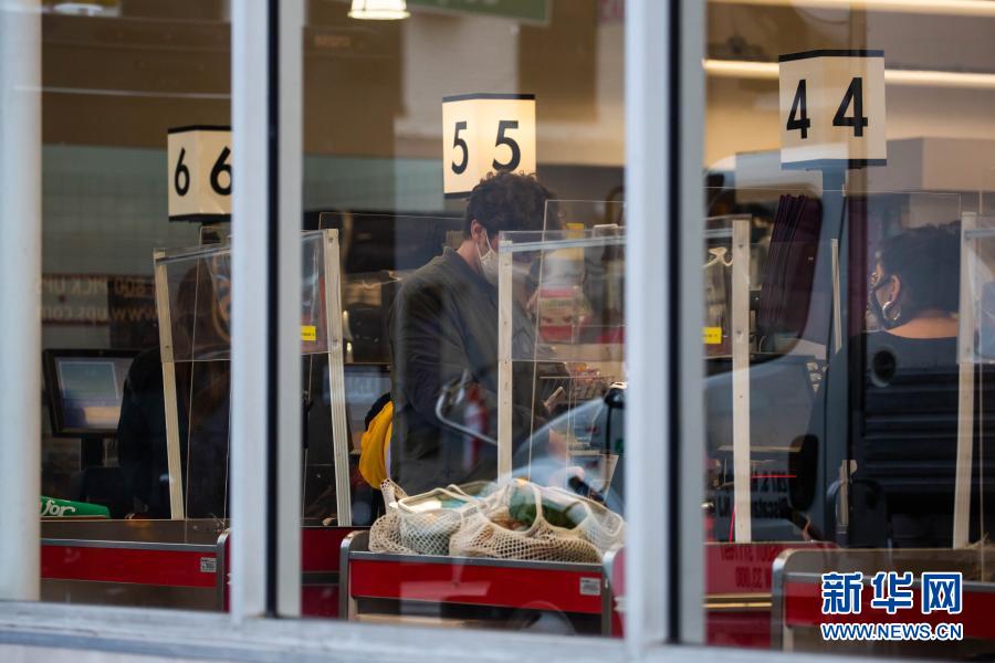11月12日,在美国纽约一家超市,人们在装有防护罩的收银台前结账。