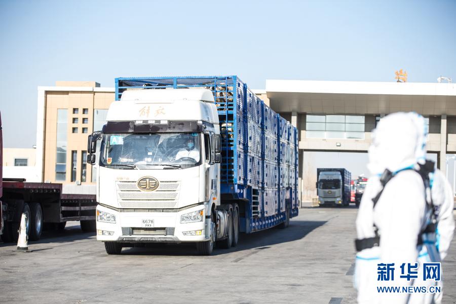 11月13日,内蒙古出入境边防检查总站二连出入境边防检查站执勤民警对载羊车辆进行车体检查。新华社发(郭鹏杰 摄)