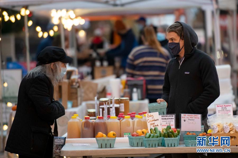 11月12日,一名女子在美国华盛顿的一处户外市场购物。世界卫生组织13日公布的最新数据显示,全球累计新冠确诊病例达52487476例。新华社记者 刘杰 摄