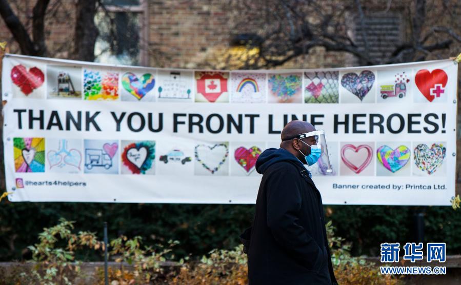 11月14日,在加拿大多伦多,一名戴口罩与面罩的男子从感谢一线医护人员的条幅前走过。
