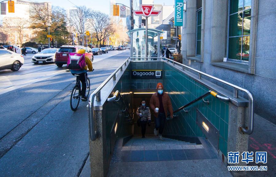 11月14日,在加拿大多伦多,戴口罩的乘客走出地铁站。新华社发(邹峥摄)