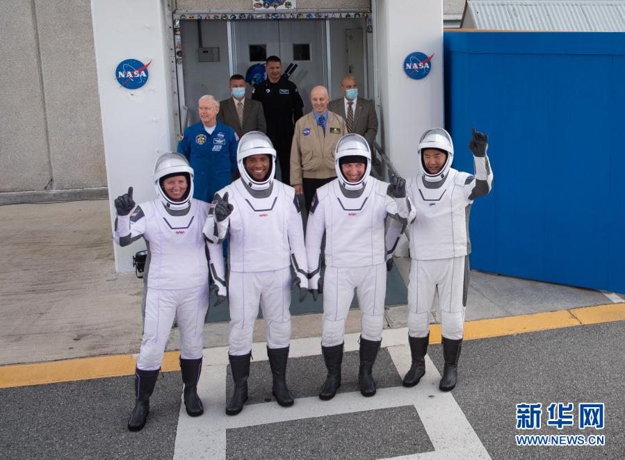 这是11月15日在美国佛罗里达州肯尼迪航天中心拍摄的参与这次代号“Crew-1”航天任务的宇航员香农·沃克,维克托·格洛韦尔,迈克尔·霍普金斯,和日本宇宙航空研究开发机构的宇航员野口聪一(从左至右)。