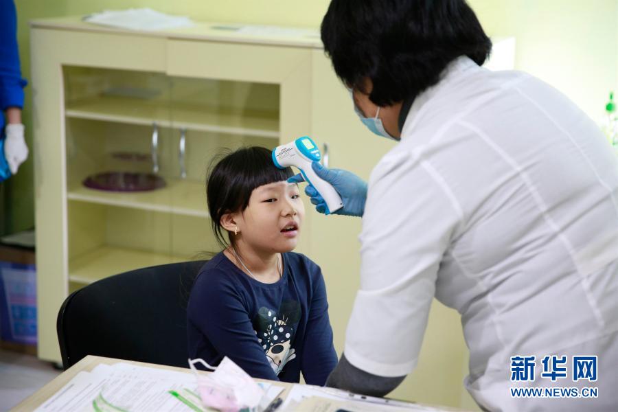 11月16日,在吉尔吉斯斯坦首都比什凯克,一名学校医务人员给小学生测量体温。新华社发(罗曼摄)