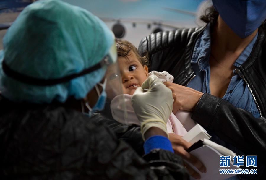 11月15日,古巴首都哈瓦那何塞·马蒂国际机场工作人员(左)为一名儿童采样以便进行核酸检测。