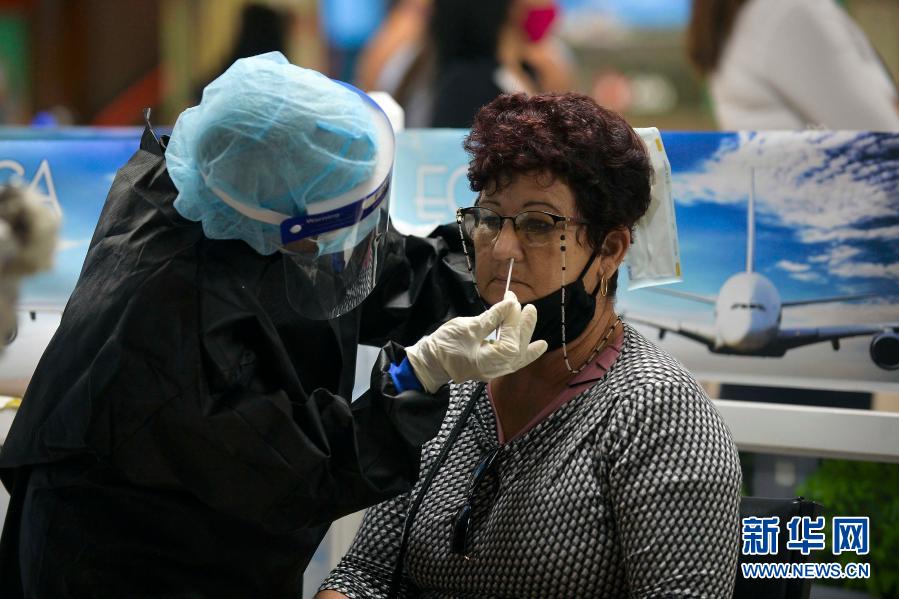 11月15日,古巴首都哈瓦那何塞·马蒂国际机场工作人员为入境旅客采样以便进行核酸检测。