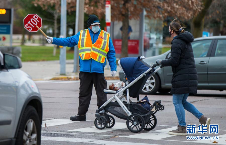11月16日,在加拿大多伦多,一名戴口罩的交通协管员指挥行人过马路。