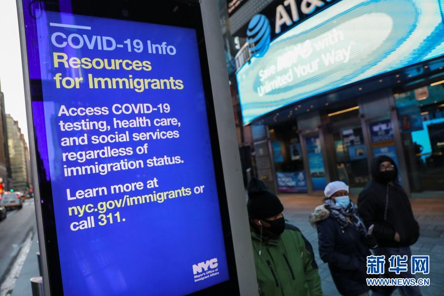 11月18日,在美国纽约时报广场,行人从显示“新冠测试”信息的电子屏旁走过。