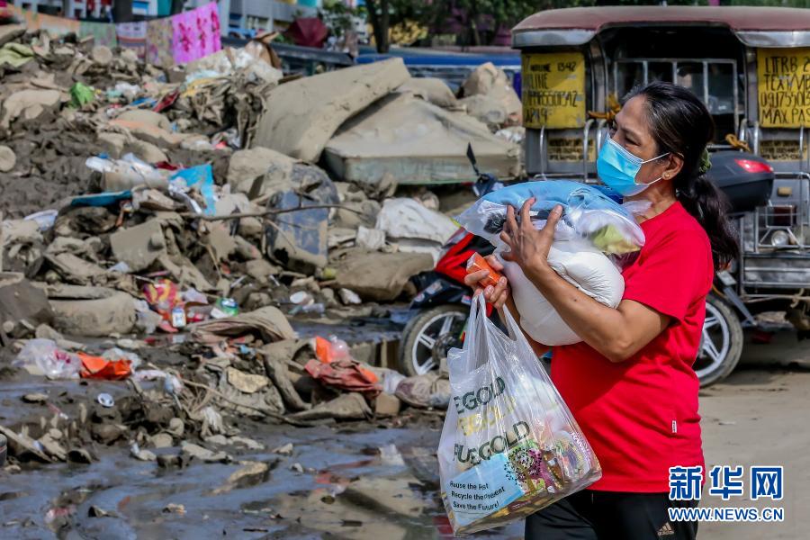 11月19日,在菲律宾马里基纳,一名女子在台风过后搬运生活用品。