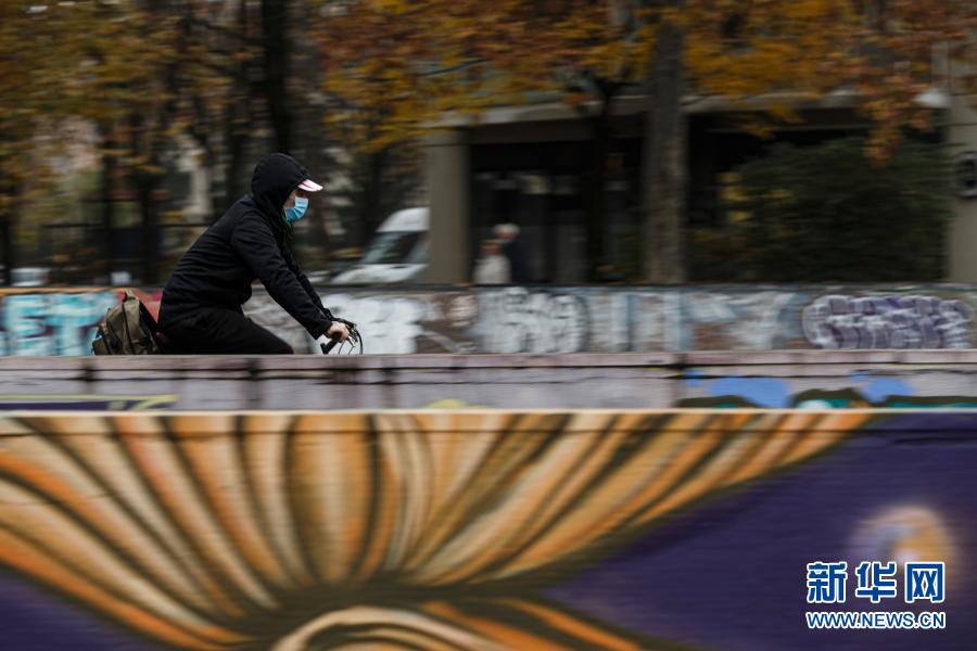 11月19日,在斯洛文尼亚首都卢布尔雅那,一名戴口罩的男子在街头骑车。据斯洛文尼亚政府当日发布的数据,该国过去24小时新增新冠确诊病例2064例,累计确诊60887例;新增死亡病例45例,为疫情以来单日死亡病例数最高点,累计死亡964例。新华社发(泽利科·斯特凡尼奇摄)