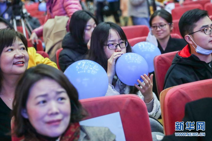 11月20日,观众在主题活动上吹起蓝色的气球。