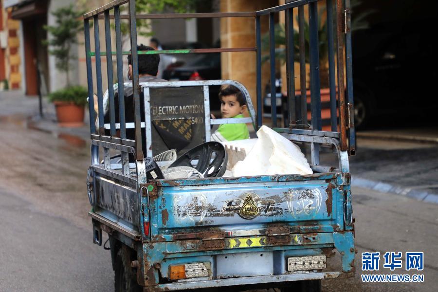 11月19日,在黎巴嫩贝鲁特,一名儿童坐在自己父亲开着的三轮车上。