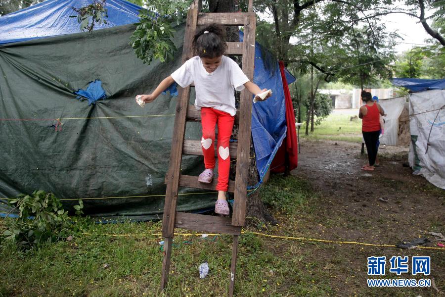11月19日,在洪都拉斯特古西加尔巴,一名女孩在一处临时安置点玩耍。