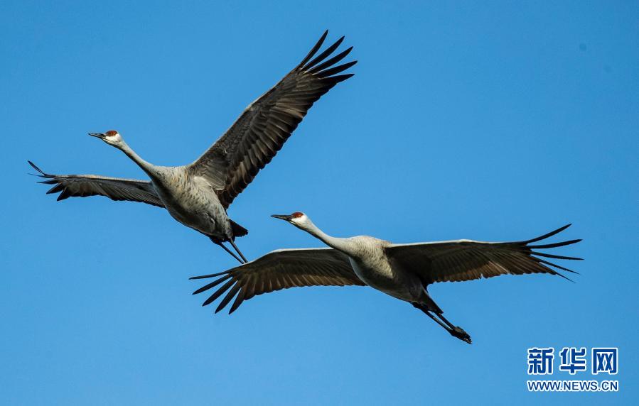 每年10月至12月初,沙丘鹤从北部繁殖地向南部越冬地迁徙时,会在美国印第安纳州梅达里维尔的贾斯珀-普拉斯基野生动物保护区栖息,吸引众多游客前来观赏,成为冬季里的一道风景。新华社发(乔尔·莱纳摄)