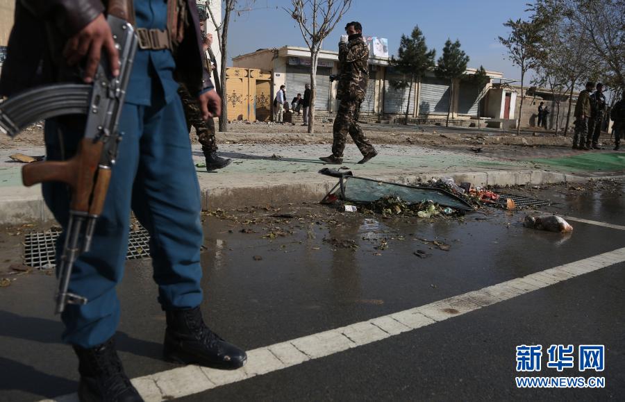 11月21日,在阿富汗首都喀布尔,安全人员查看遭遇火箭弹袭击的地点。