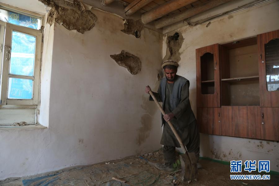11月21日,在阿富汗首都喀布尔,一名男子清理一处在火箭弹袭击中受损的房屋。