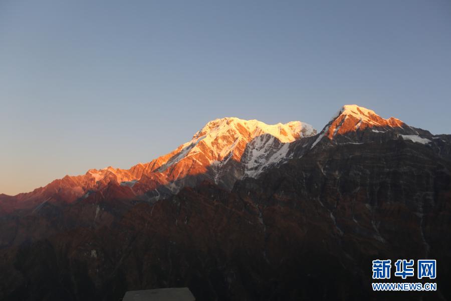 这是11月11日在尼泊尔安纳布尔纳地区拍摄的雪山日出景色。
