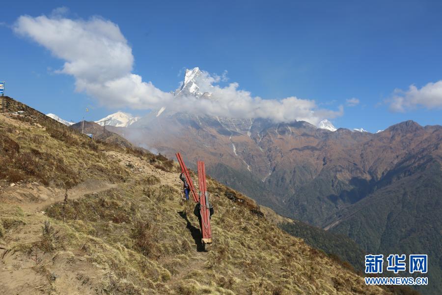 11月11日,几名搬运建筑材料的挑夫走在尼泊尔安纳布尔纳地区。人力搬运是山区运输物资的重要途径之一。