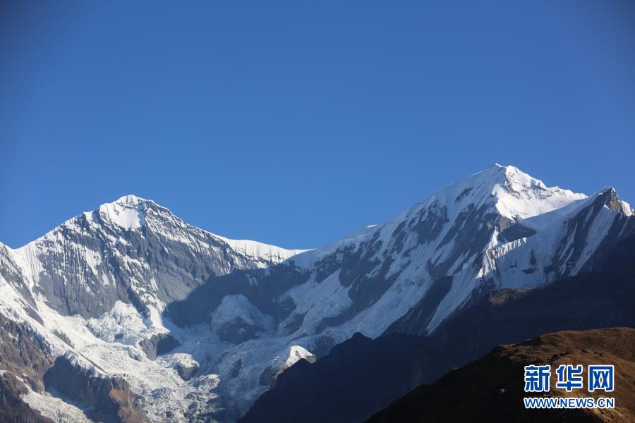 这是11月11日在尼泊尔安纳布尔纳地区拍摄的朝霞中的雪山。
