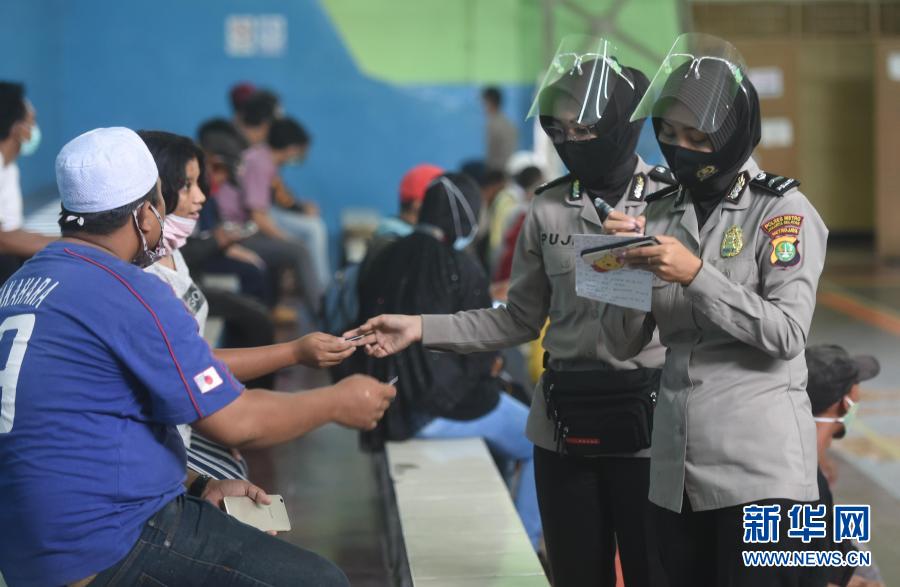 11月23日,在印度尼西亚雅加达,警察对接受新冠病毒检测的居民进行登记。