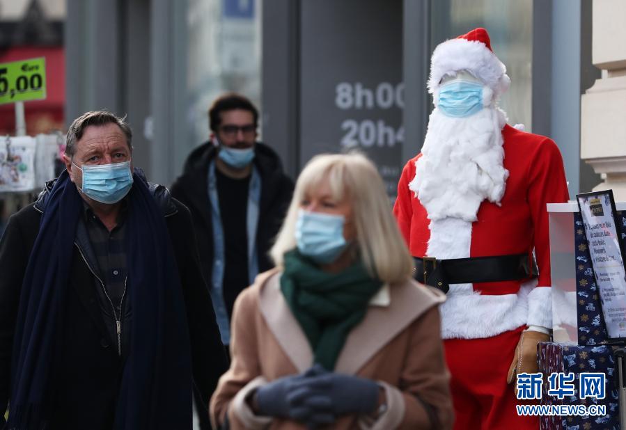 11月25日,人们从法国巴黎一家超市外戴口罩的圣诞老人模特旁走过。法国总统马克龙24日发表电视讲话说,鉴于法国第二波新冠疫情高峰已经过去,计划从11月28日起分三个阶段解除封禁措施。新华社记者 高静 摄