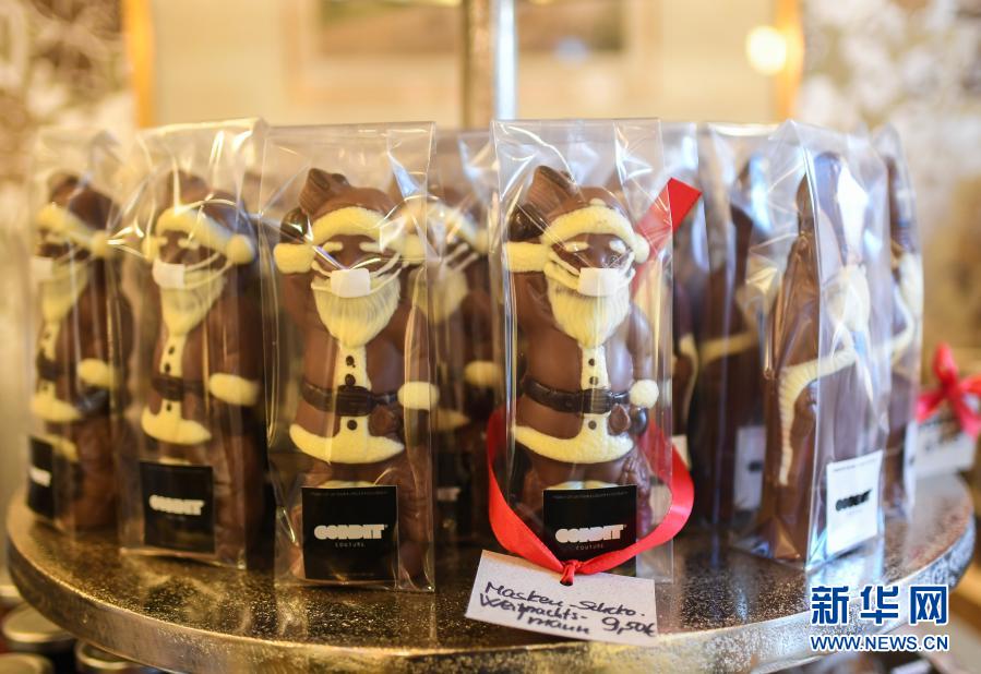 这是11月25日在德国法兰克福一家糕点店内拍摄的戴口罩的圣诞老人造型巧克力。