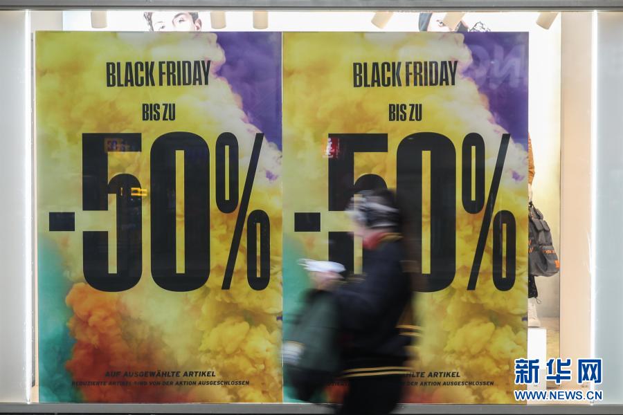 11月26日,在德国首都柏林,一名行人经过一家购物中心展示“黑色星期五”促销广告的橱窗。
