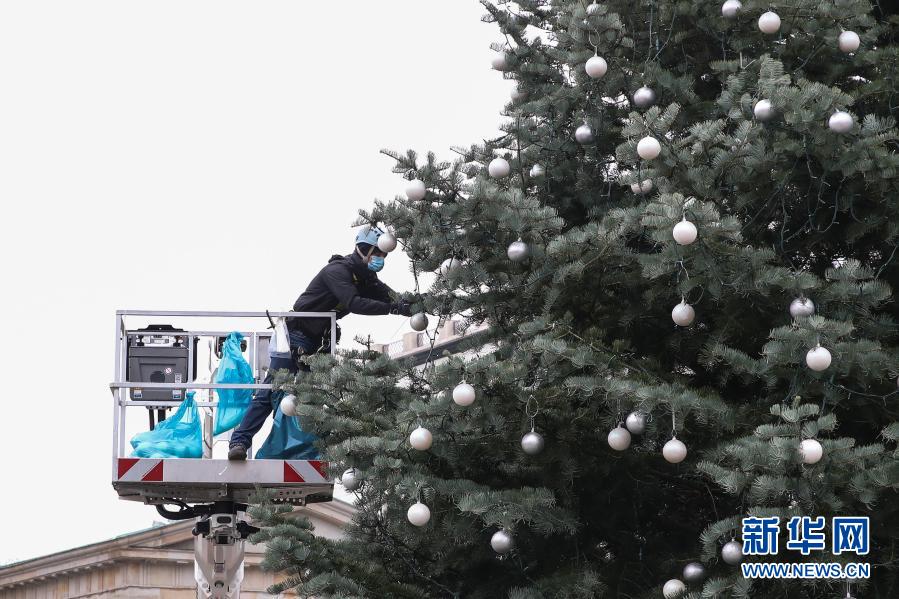 11月26日,在德国首都柏林,工作人员装饰勃兰登堡门前的圣诞树。