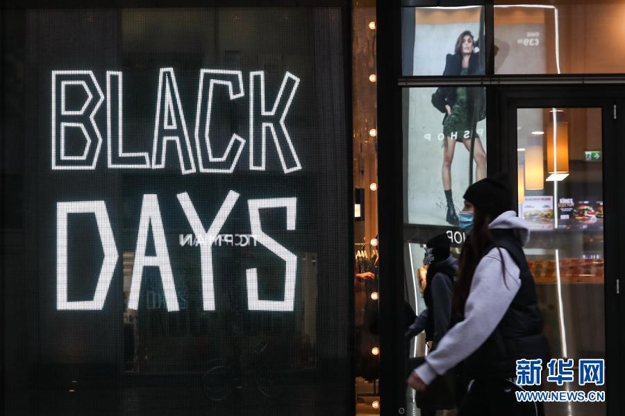 11月26日,在德国首都柏林,一名行人走过一家商店的广告显示屏。